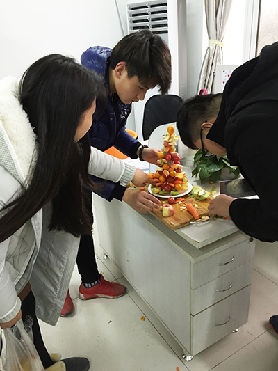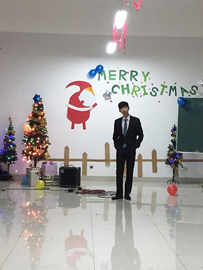 上午课程结束后,同学们开始着手打造节日的气氛,用彩带、圣诞树、喷漆、手绘等装饰教室,还分组去超市采购了派对上的休闲零食。下午14:30,圣诞派对正式开始。喻丁晨同学以一段精心编排的圣诞歌曲电贝斯演奏开场。随后进行了各种有趣的游戏,老师和同学们一起参与游戏,相互配合,玩得不亦乐乎。同学们也各自展示了才艺――吉他弹唱、即兴脱口秀、舞蹈表演等等。