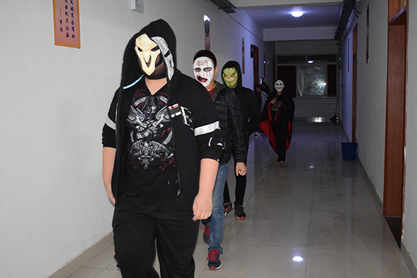 所有着盛装的师生进行了一场特色走秀。有人装扮成僵尸、吸血鬼、魔鬼、女巫;有人装扮成精灵、海盗、南瓜娃娃等等各种有趣的万圣节扮相。