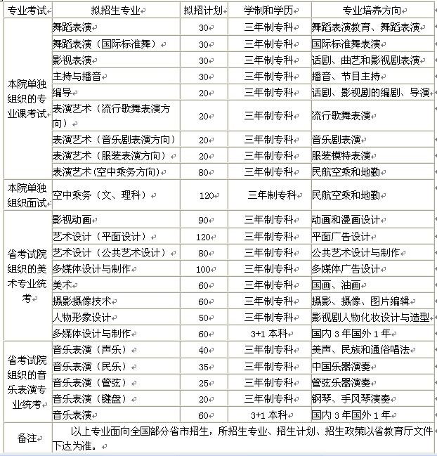 1.招生对象:必须是已参加了今年普通高考艺术类文化课报名并领取附有考生号的数码相片和专业课报名通知单,能参加今年全国普通高考的考生(空中乘务专业为普通文理科招生),身体条件符合《普通高校招生体检工作指导意见》的要求。