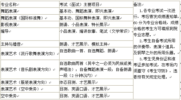 2.报名办法和时间:本院单独组织的舞蹈表演、影视表演、编导、主持与播音、表演艺术、空中乘务等六个专业考试报名时间:元月20日起。地点:丹霞路校区。报名办法:考生一律面报。报名须交验:①身份证和身份证复印件(备存);②市、县招办打印的专业课报名通知单和附有考生号的彩色照片3张;③缴纳报名考试费用100元。