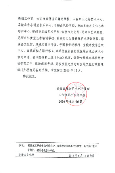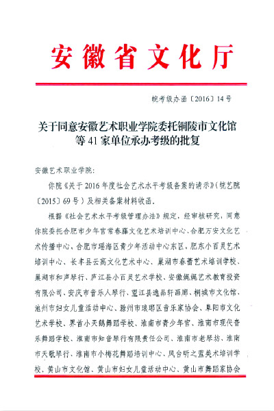 文化厅关于同意永利欢乐娱人城委托铜陵市文化馆等41家单位承办考级的批复