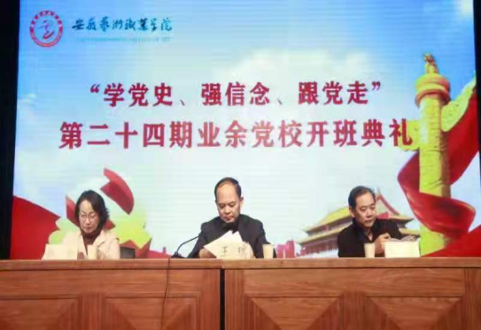 在庆祝建党100周年之际,为加强党的理论教育,结合我院“学党史、强信念、跟党走”主题活动,提高广大青年教师和学生的思想政治素质,严把党员发展“入口关”,11月29日晚,我院“学党史、强信念、跟党走”第二十四期业余党校在丹霞路校区舞蹈楼剧场顺利开班。党委书记王瑞出席典礼,学生处处长刘彦、马克思学院院长张敏、各二级学院党总支书记、院团委委员、各团总支书记、全体学员参加了本次典礼。典礼由学生处副处长卞振武主持。