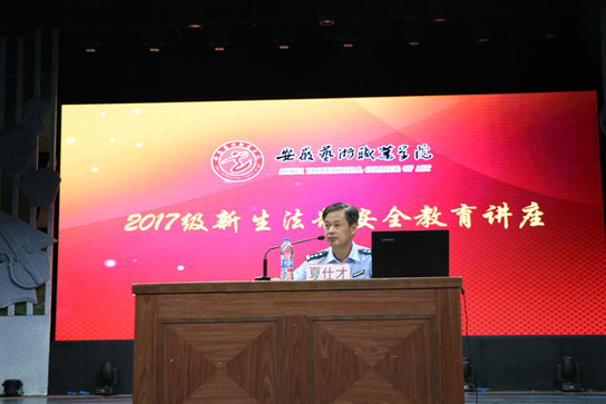 为提高新生的法制观念,树立良好的安全防范意识,9月16日上午,学院特别邀请了合肥市公安局国保支队五大队大队长夏仕才,分别在新、老校区为全体新生进行法制安全教育讲座。