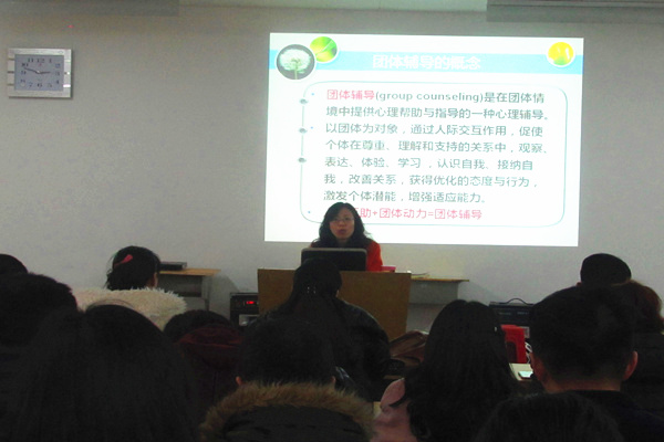 培训分为讲座和实训两个版块。郑教授在首先开展题为“团体心理辅导的理论与技术”的讲座培训,以心理学和学生工作两个切入点,引入了团体心理辅导,生动讲述了团体心理辅导的作用、基本方法及技巧,用实例展现了团体心理辅导的有效性。