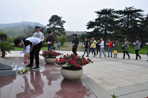 在田老师的指导下,同学们依次在烈士陵墓前,为先烈们献上了自己亲手折的白花,默哀致意以寄托对先烈们的哀思。