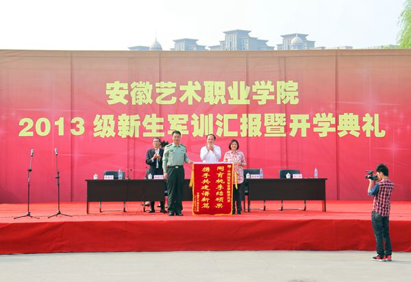 大会分为军训汇报、开学典礼和迎新演出三个部分:第一部分军训汇报,在雄壮的解放军进行曲中阅兵式开始,院党委书记王瑞在顾金辉政委的陪同下逐一检阅了整齐划一的受训方队。伴随雄壮的阅兵曲,分列式开始。各方队军姿挺拔、士气高昂、意气风发,迈着矫健的步伐从主席台一一走过,嘹亮的口号响彻了操场上空。随后是各系组成的表演方队进行军体拳、韵律操、女子防身术、搏击操、刺杀操等汇报表演,他们精神抖擞、斗志昂扬充分展示了军训的成果,赢得了与会领导及其他受训新生的阵阵掌声和喝彩。汇报表演结束后,党委委员、院长助理(教务处处长)周爱宝同志宣读了《关于表彰2013级新生军训优秀学员的决定》,与会领导并为“优秀学员”代表颁奖。接着,副院长王红向军训承训单位中国人民解放军陆军军官学院步兵系领导赠送了锦旗,表达全院师生员工对承训部队官兵的深情厚谊。