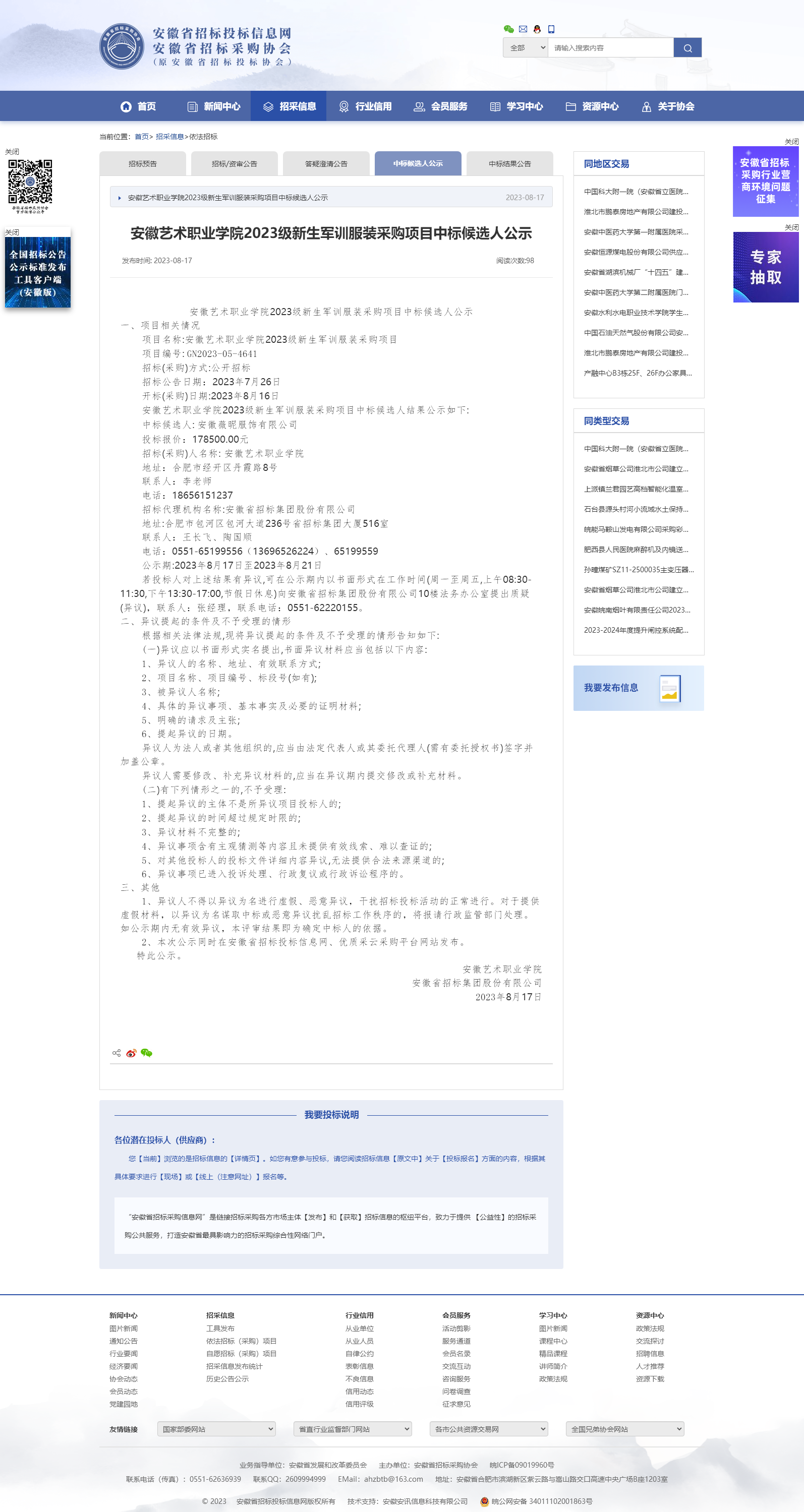 永利欢乐娱人城2023级新生军训服装采购项目中标候选人公示